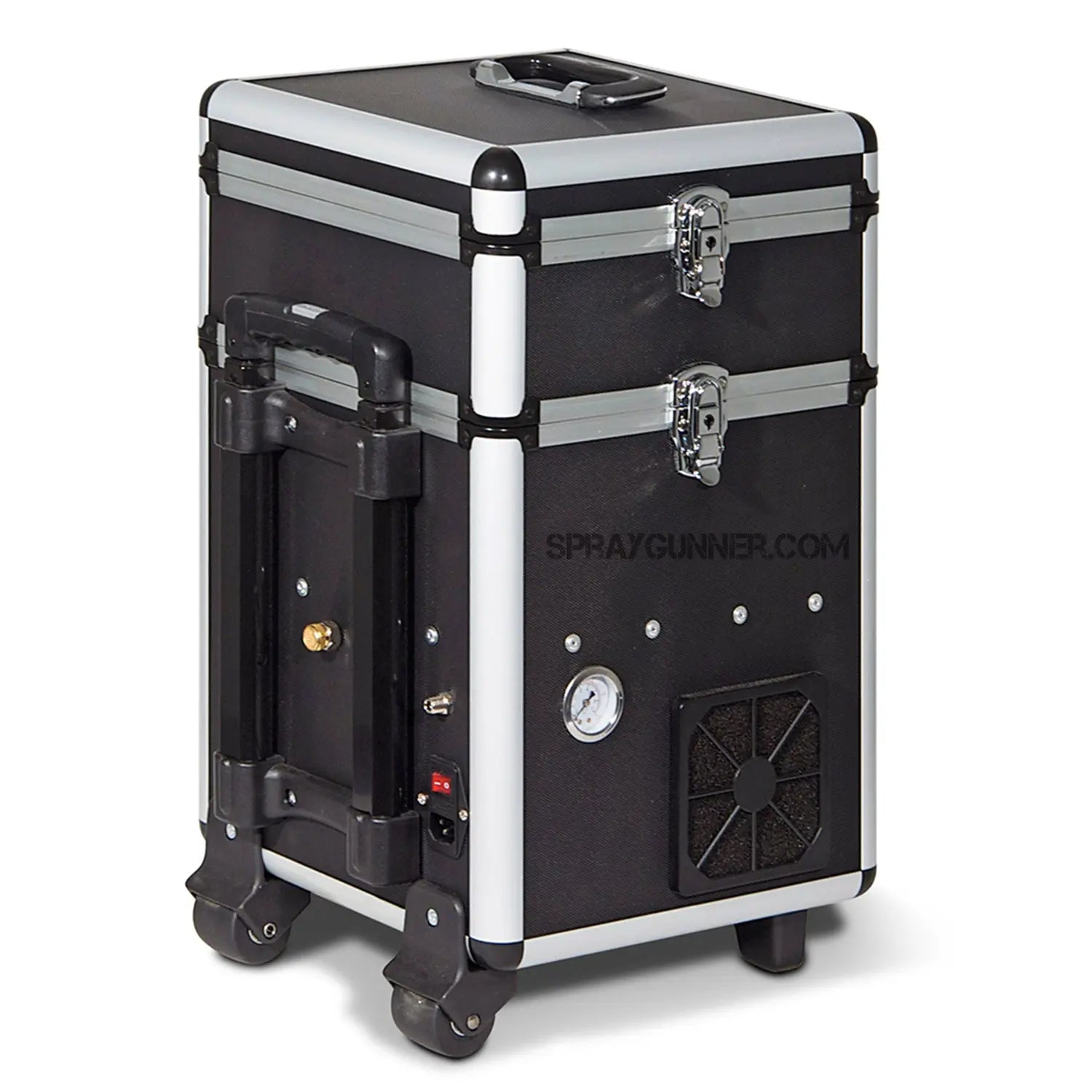 Iwata Maxx Jet is equipped with a pressure gauge that displays the tank pressure in the 2.5 liter air storage tank and the gauge on the regulator displays the working pressure. The moisture filter traps condensation within the cup delivering clean, dry air. Using the adjustment levers on the manifold, you can independently regulate the air pressure to each air hose, giving you total control. Auto shut-off technology enables the compressor to shut itself off when not in use. This feature upgrade is known to lengthen the life span of the compressor motor because it reduces the workload of the motor over time. The powerful two pole 1/6 hp motor is oil-less, has a 2.5 liter air storage tank and stays cool with the built-in internal cooling fan. The air intake filter protects the motor from dust and particulates and is designed for easy-access filter cleaning. The protective travel case includes a convenient retractable handle. The detachable top opens a handy storage tray and the case contains two built-in storage drawers. Turn the unit on and off with a convenient switch mounted into the outer case and when you are finished you can detach the power cord for convenient mobility.