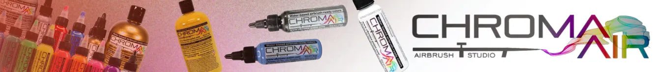 For best results, apply thin layers at moderate PSI (15–25), allowing each coat to dry before adding another. You can mix ChromaAir transparent paints with other water-based colors or reducers to adjust opacity. Clean easily with ChromaAir Cleaner or mild water-based solvents after each session.