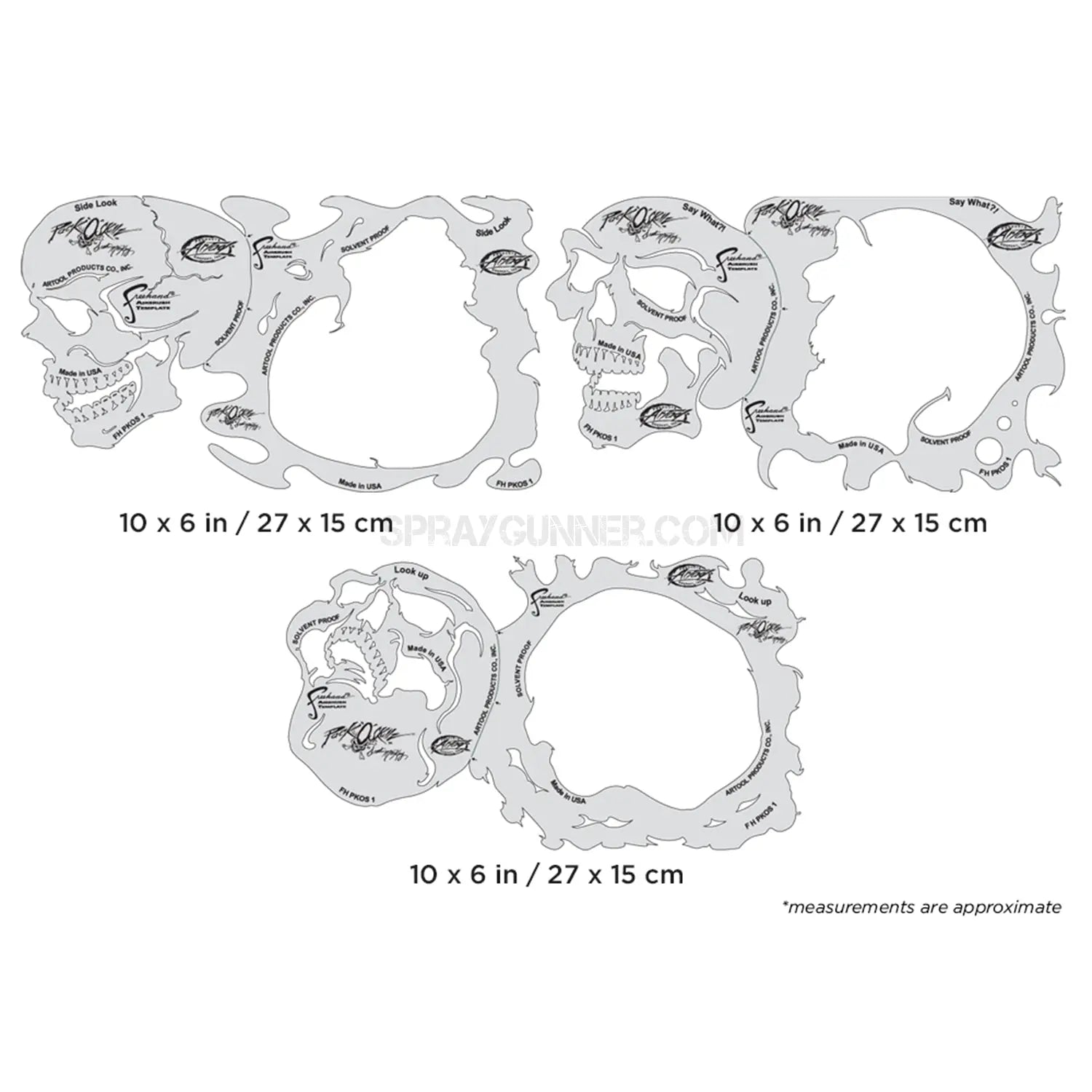 Artool Pack o' Skullz Freehand Airbrush Template by Scott Mackay. Precision, laser cut stencils for highly detailed effects. Solvent Proof mylar construction: great with both solvent and water based paints. Easy to clean. Create your favorite effects with Artool.